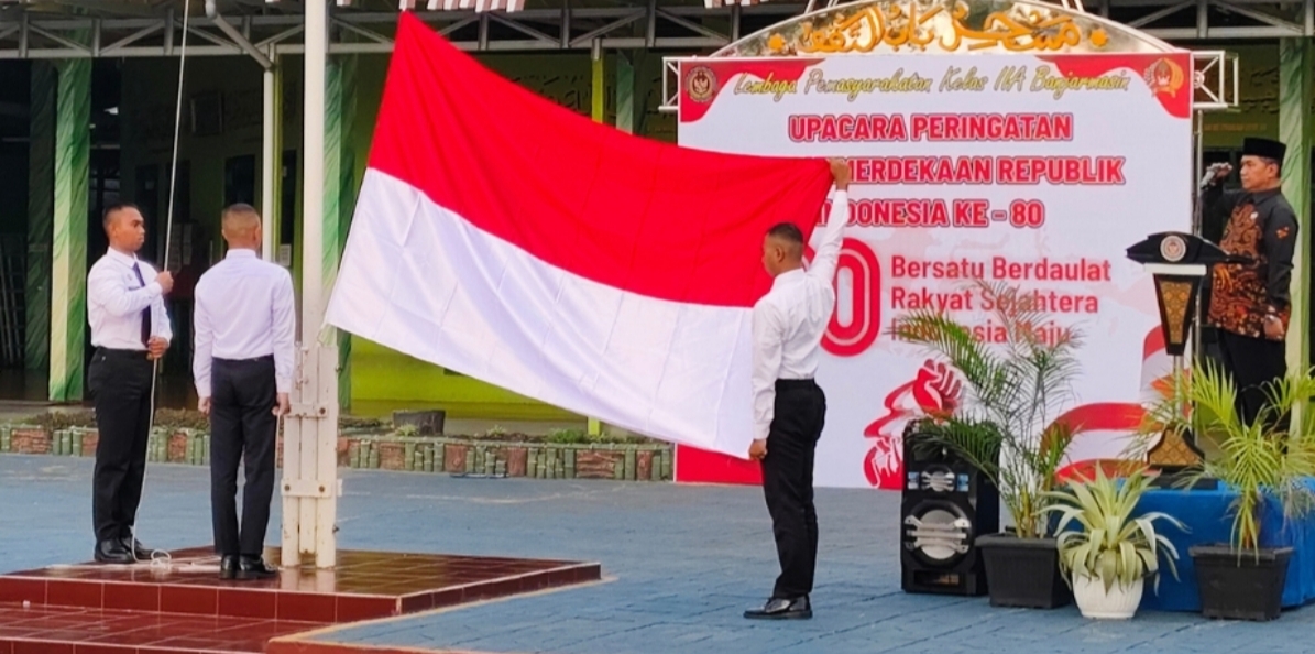 Suasana khidmat menyelimuti halaman utama Lembaga Pemasyarakatan (Lapas) Kelas IIA Banjarmasin saat pelaksanaan Upacara Bendera memperingati Hari Ulang Tahun (HUT) ke-80 Republik Indonesia pada Minggu (17/08) pagi.